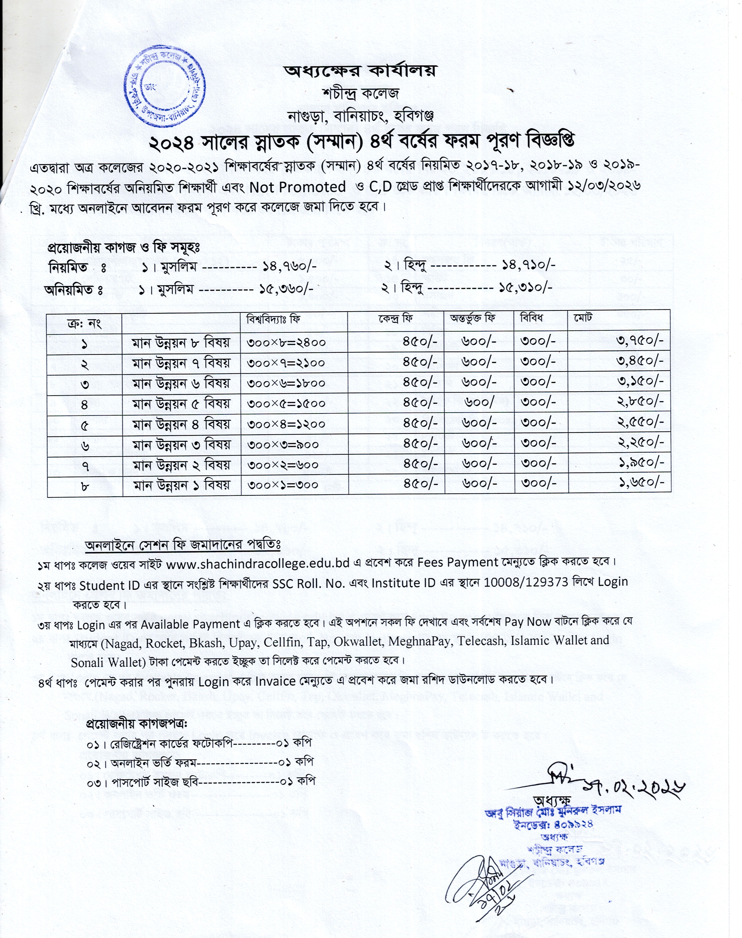 ২০২৪ সালের স্নাতক (সম্মান) ৪র্থ বর্ষের ফরম পূরণের সংশোধিত বিজ্ঞপ্তি
