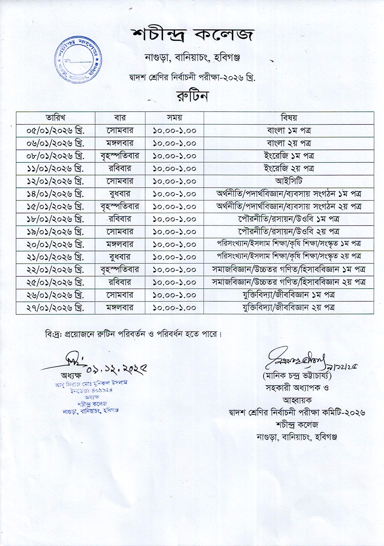 দ্বাদশ শ্রেণির নির্বাচনী পরীক্ষার রুটিন-২০২৫