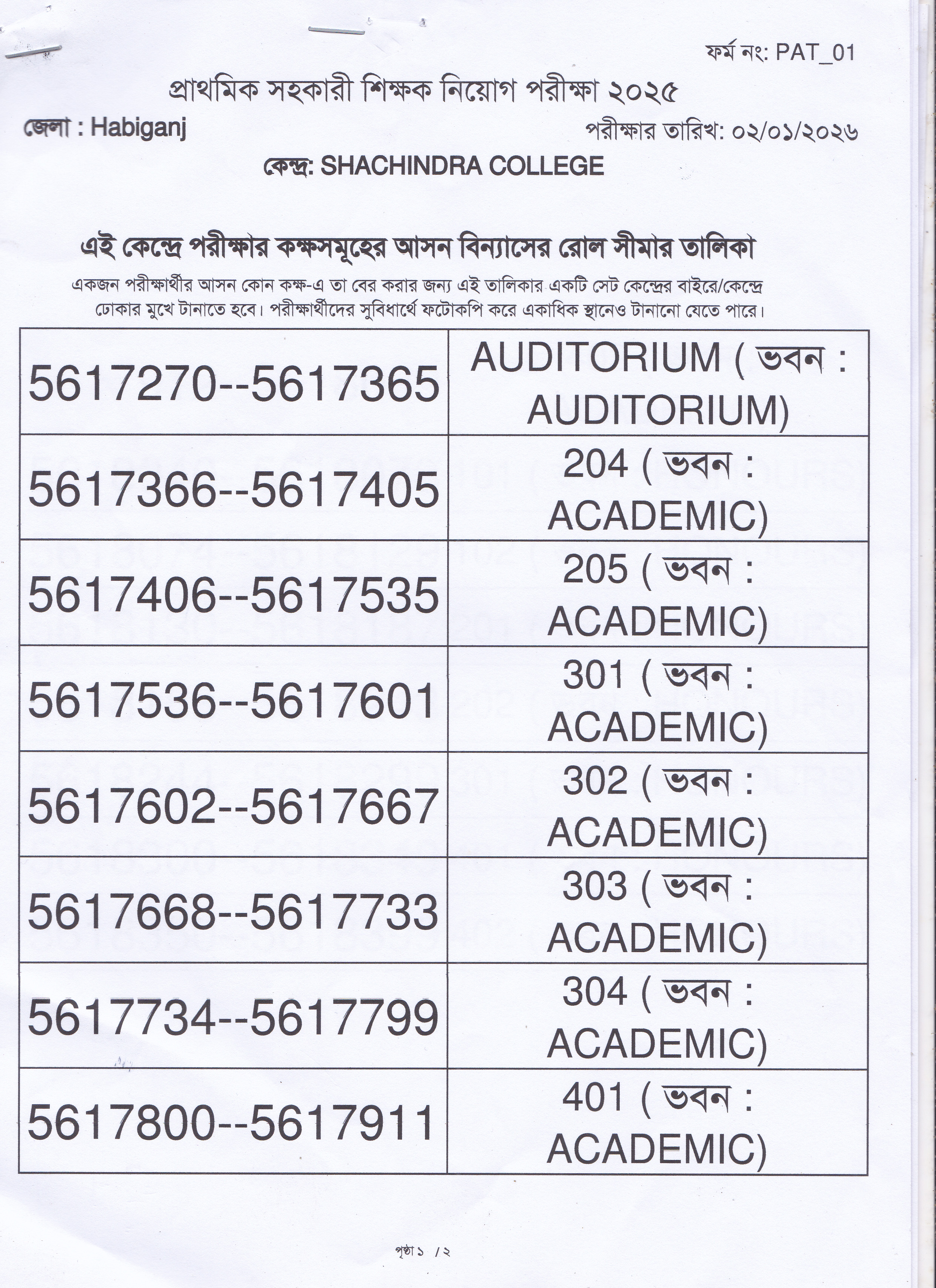 ০৯/০১/২০২৬ খ্রি. তারিখের প্রাথমিক সহকারী শিক্ষক নিয়োগ পরীক্ষা-২০২৬ এর আসন বিন্যাস। কেন্দ্রঃ শচীন্দ্র কলেজ