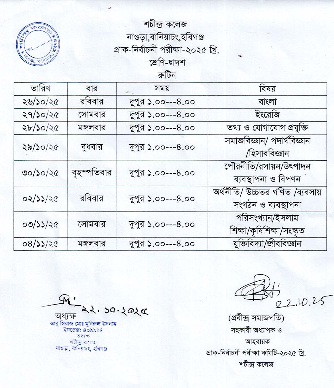 দ্বাদশ শ্রেণির প্রাক নির্বাচনী পরীক্ষার রুটিন-2025